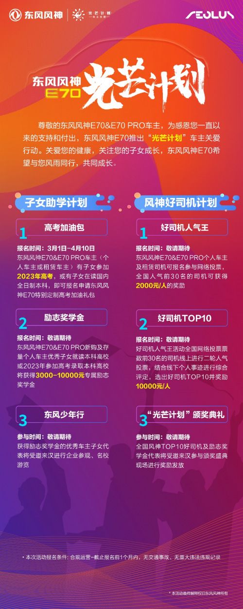 后续“光芒计划”会陆续推出车主子女励志奖学金、东风少年行、毕业实习绿色通道等多重关爱活动。东风风神E70希望与广大车主司机朋友风雨同行,助力司机子女健康成长。(齐鲁晚报网)