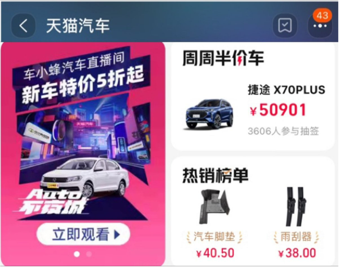 天猫汽车专门推出“Auto不夜城”专场活动,给到品牌方/经销商开播的加持,在汽车行业的各场域中给予流量支持,拉升直播间用户关注,车型优惠咨询直线上升。