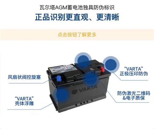 此外,瓦尔塔AGM蓄电池更有正极 “VARTA”品牌商标压印防伪、风扇状阀控旋塞等独具防伪标识,帮助车主更直观、更清晰地识别正品。