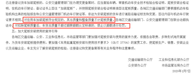 说到这,可能就会有卡友疑惑,蓝牌轻卡新规实行以来,面对总重不超4.5吨的铁律,经济效益也随着载货量的降低而有所减少,加装液压尾板后轻卡自重岂不是又要上升,进一步压榨载货量吗?其实这也无需顾虑,因为国家交通部其实早已发文明确加装符合规定的尾板,其总质量和整备质量不计尾板质量。所以合规合法,又能降本增效的液压尾板轻卡毫无疑问就是当前的最优解之一。