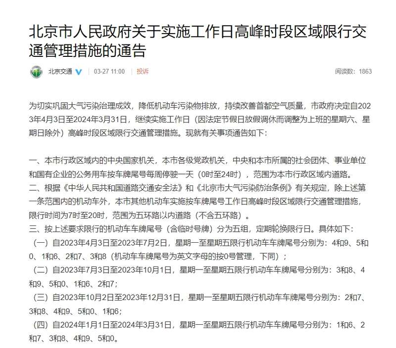 通告表示,根据《中华人民共和国道路交通安全法》和《北京市大气污染防治条例》有关规定,除上述第一条范围内的机动车外,北京市其他机动车实施按车牌尾号工作日高峰时段区域限行交通管理措施,限行时间为7时至20时,范围为五环路以内道路(不含五环路)。
