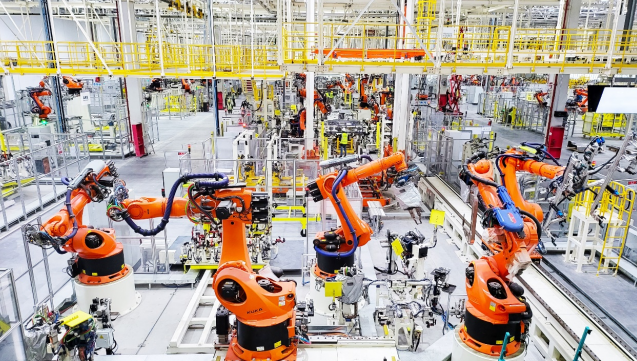 数字化全机器人焊装车间——采用行业最高水平的全数字化设计仿真技术,AI视觉在线100%精度检测,应用数字化仿真技术的德国KUKA机器人焊接强度合格率高达99.8%。
