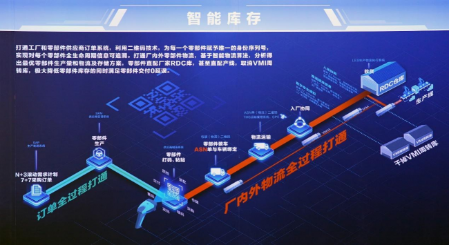 智能库存——打通工厂和零部件供应商订单系统,利用二维码技术,为每一个零部件赋予唯一的身份序列号,实现对每个零部件全生命周期信息可追溯。打通厂内外零部件物流,基于智能物流算法,分析得出最优零部件生产量和物流及存储方案,零部件直配厂家RDC库,甚至直配产线,取消VMI周转库,极大降低零部件库存的同时满足零部件交付0延误。