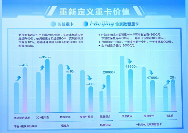 凭借Smart AEO智能自主寻优节油系统、Smart SAVE智能云控节油系统、Smart EBP智能油耗管理系统、Smart EBI智能制动系统4大“Smart”核心系统加持,北京重卡在实现智能节油与智能安全的同时,每年可以节省油费48600元,节省维保费用47000元。高质量的北京重卡可以达到月出勤大于28天,一年多出勤一个月,一年多赚30000元,全年创造价值可达130000元。