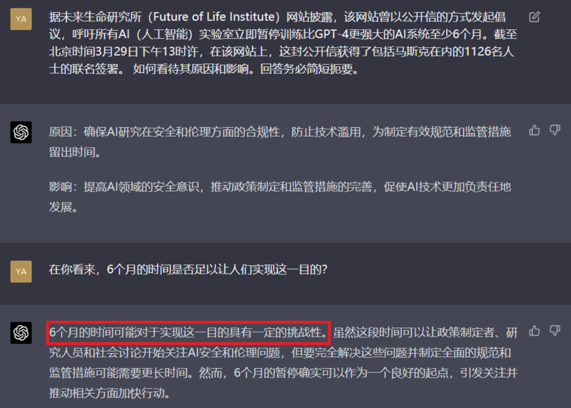 当被问道,“在你看来,6个月的时间是否足以让人们实现这一目的?”GPT-4认为,虽然这段时间可以让政策制定者、研究人员和社会讨论开始关注AI安全和伦理问题,但要完全解决这些问题并制定全面的规范和监管措施可能需要更长时间。然而,6个月的暂停确实可以作为一个良好的起点,引发关注并推动相关方面加快行动。