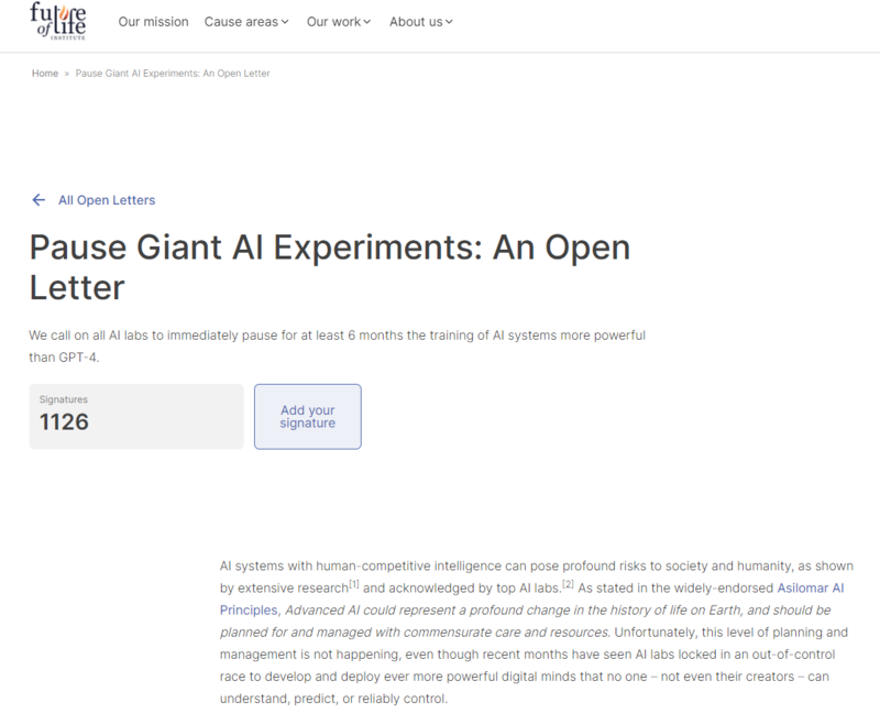 据未来生命研究所(Future of Life Institute)网站披露,该网站曾以公开信的方式发起倡议,呼吁所有AI(人工智能)实验室立即暂停训练比GPT-4更强大的AI系统至少6个月。截至北京时间3月29日下午13时许,在该网站上,这封公开信获得了包括马斯克在内的1126名人士的联名签署。