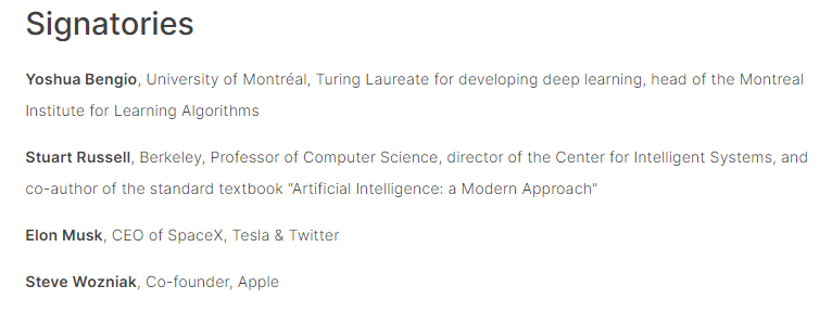 网站最新页面显示,在该公开信的联合签名栏,有众多大学学者、工程师和企业创始人和高管在列。例如“图灵奖”获得者约书亚·本希奥、特斯拉CEO马斯克、苹果联合创始人史蒂夫·沃兹尼亚克等。这份名单中也包括一些记者、教师和学生的名字。