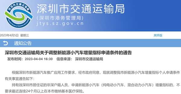 《通告》指出,持有效深圳市居住证的非深户籍人员,申请新能源小汽车(纯电动小汽车、混合动力小汽车)增量指标的,不要求最近连续24个月以上在本市缴纳基本医疗保险。该政策将实施至2023年12月31日。