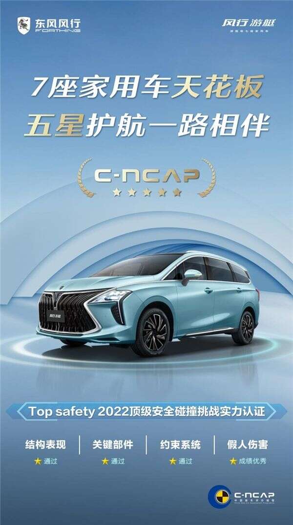 众所周知,2021版C-NCAP规程,被汽车行业誉为史上最严新规程,而风行游艇以综合得分率高达83.3%的成绩斩获五星认证,成为汽车史上首个以MPV车型身份成功挑战2021版C-NCAP规程并获得五星认证的7座家用车,可谓收获了满分的安全背书。