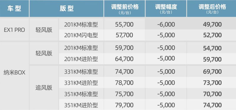 据了解,此次价格调整涵盖东风纳米旗下EX1 PRO、纳米BOX等热销车型,最高调整幅度达6000元。调整后,纳米BOX轻风版顶配车型的官方指导价降至5万级,纳米BOX追风版331km续航版本的入手门槛也降至7万元以内。