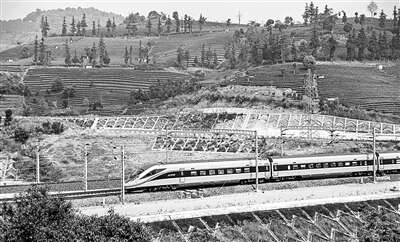 13日,首发列车驶过位于云南省普洱市的一处茶山