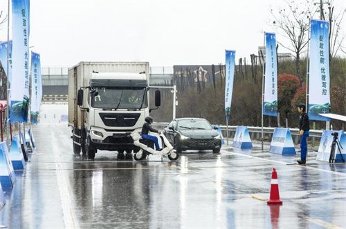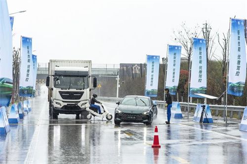 测试现场工况全面完整地还原了真实的行车场景,初始阶段测试车在湿滑路面跟随大货车行驶,之后发生大货车急停状况,在不具备刹停条件的情况下,上汽名爵MG7做出了第一次极限避险动作,避免追尾事故的发生;随后,二轮车突然出现在大货车车头部位,意图横穿机动车道,上汽名爵MG7又在通过空间被压缩的情况下,完成对二轮车的躲避;紧接着几乎同时时间,二轮车前方附近出现对向横穿机动车的行人,上汽名爵MG7又在纵向距离十分极限的情况下完成了车道切换,成功躲避穿行的行人。结果显示,上汽名爵MG7在极短时间内顺利完成连续三次紧急避险,且整个驾驶过程平稳流畅,没有与行人以及二轮车假人发生任何接触,表现出了最完美的操控性能!