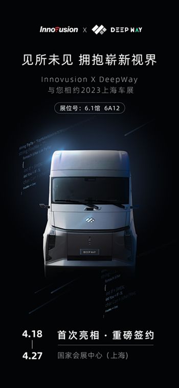 (2023年4月18日,上海)上海国际车展开幕首日,卡车造车新势力DeepWay与全球领先的图像级激光雷达解决方案提供商Innovusion联合宣布开启战略合作。在位于上海国家会展中心6.1H馆的Innovusion展台上,双方举办签约仪式。同时,DeepWay智能新能源重卡“深向星辰”车辆也首次亮相上海车展。