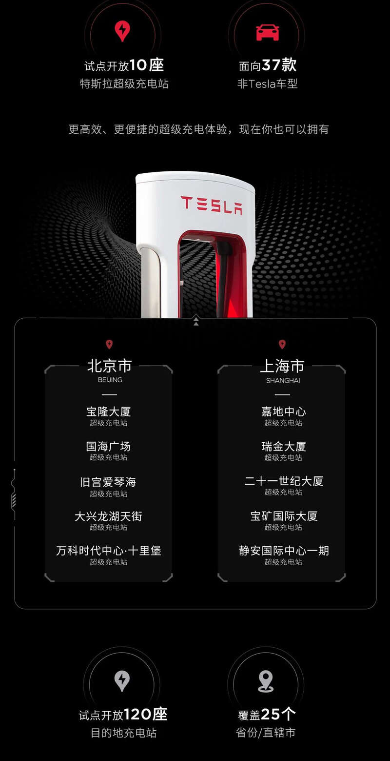 4月25日,据特斯拉官方微信公众号消息,中国大陆地区特斯拉面向其他部分非特斯拉新能源车辆试点开放充电网络,首批试点开放10座特斯拉超级充电站,面向37款非Tesla车型。试点开放120座目的地充电站,覆盖25个省份/直辖市。