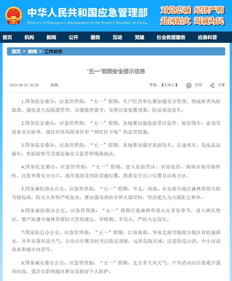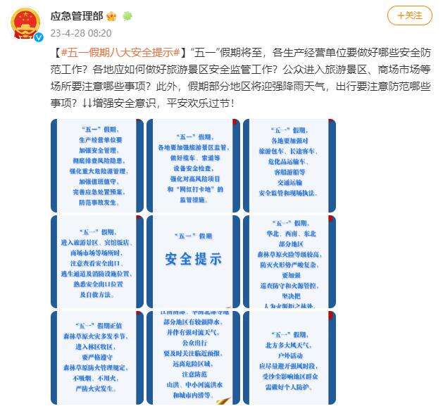 2.国务院安委办、应急管理部:“五一”假期,各地要加强旅游景区监管,做好缆车、索道等设备安全检查,强化对高风险项目和“网红打卡地”的监管措施。