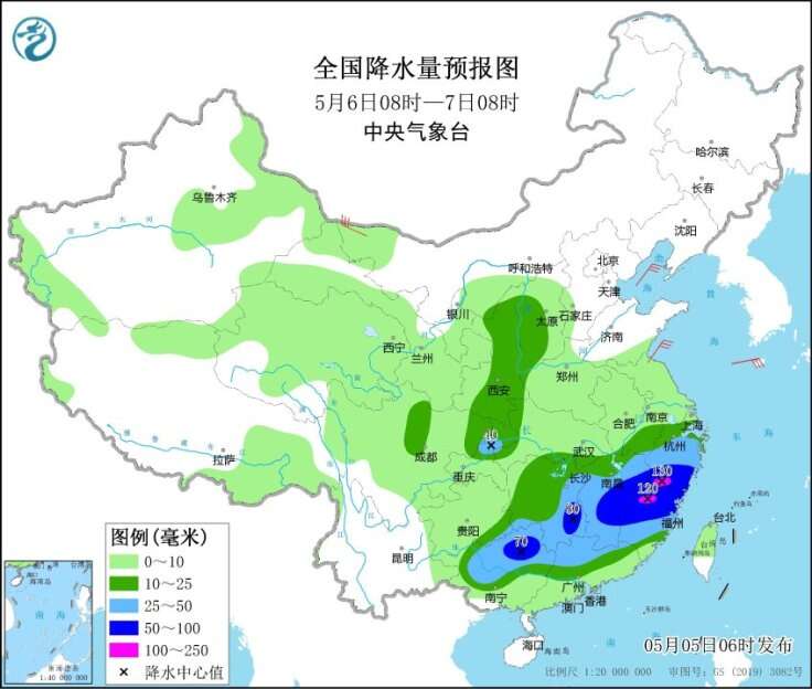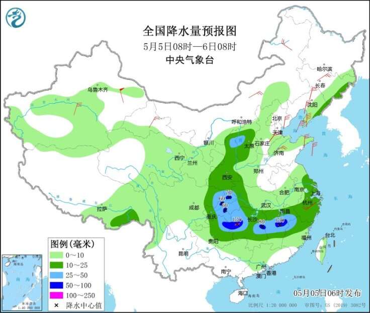 中央气象台预计,未来三天(5日至7日),我国主雨带将分为两支,其中一支位于江南、华南中北部及西南地区东部,该区域降雨强度大、持续时间长,并伴有强对流天气,其中湖南中部、江西中部、浙江西部、福建西北部等局地累计降雨量超过100毫米,最强降雨时段为6日;雨带的另外一支位于陕西、山西等地,该区域以稳定性降雨为主,主要降雨时段为5日夜间至6日白天。