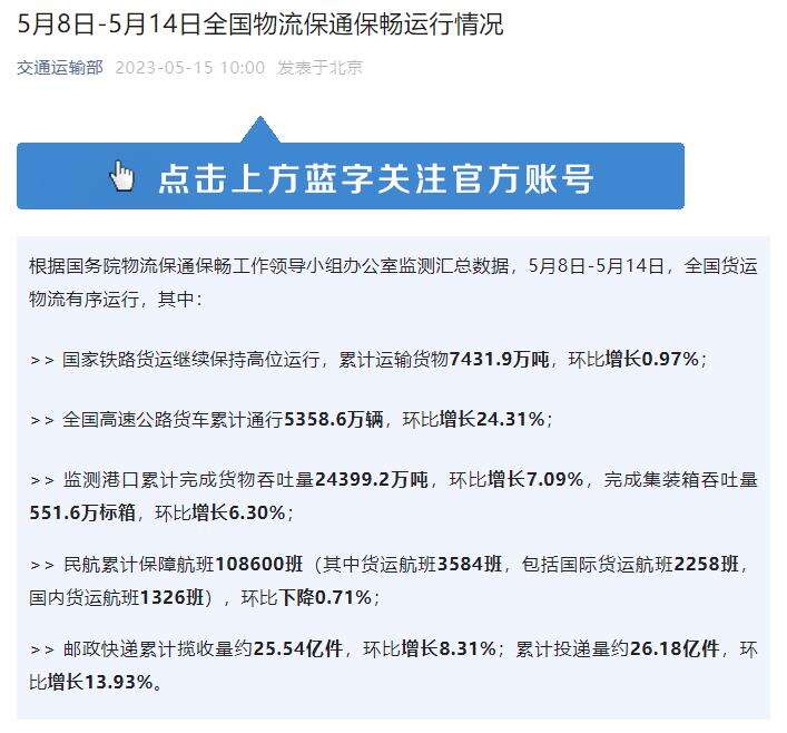 央视网消息:根据国务院物流保通保畅工作领导小组办公室监测汇总数据,5月8日-5月14日,全国货运物流有序运行,其中: