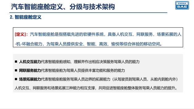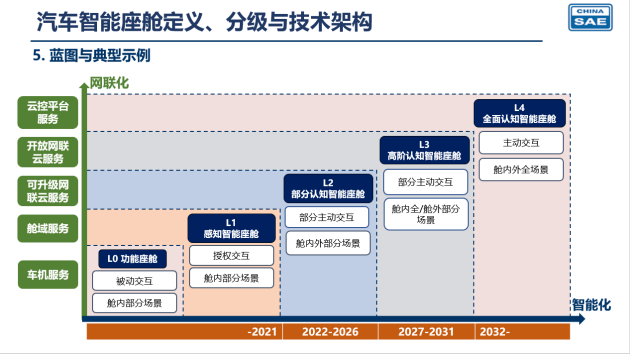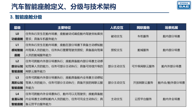 白皮书以技术引领和应用规范为目标,从人-机-环融合的角度对智能座舱进行定义分级,从人机交互、网联服务、场景拓展三个核心能力的演进,提出了从“功能座舱”到“全面认知智能座舱”的五个智能座舱级别。