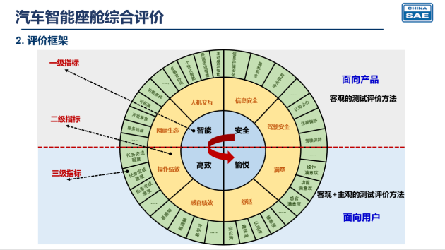白皮书构建了智能座舱评价框架体系,从产品和用户两个角度提出包括安全、智能、高效和愉悦四个一级指标。安全和智能主要用于评价座舱的产品先进性,高效和愉悦主要用于评价用户体验。评价体系为智能座舱测评提供了方向性、框架性的参考和指引,评价体系对三级及以下指标保持开放性,后续做到可持续迭代升级。
