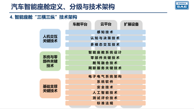智能座舱涉及汽车、人机交互、信息通信、人工智能等多领域技术和多学科交叉,其技术架构较为复杂。白皮书初步提出了汽车智能座舱“三纵三横”技术架构,“三横”是指智能座舱主要涉及的人机交互技术、系统与零部件关键技术和基础支撑关键技术,“三纵”是指支撑智能座舱发展的车舱平台、云平台和扩展设备。