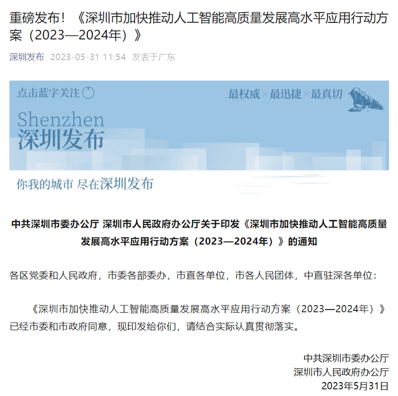 中国质量新闻网讯(安宇航)5月31日,《深圳市加快推动人工智能高质量发展高水平应用行动方案(2023-2024年)》印发。