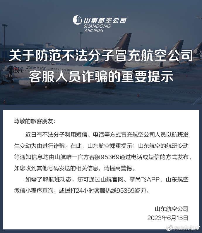山东航空发布提示:近日有不法分子冒充航司人员以航班发生变动为由诈骗
