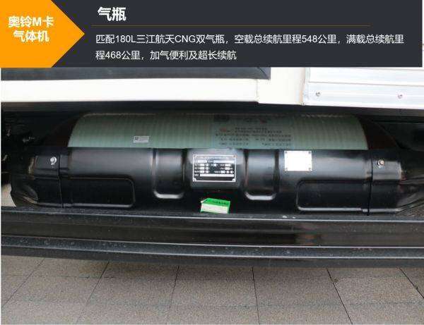奥铃M卡气体机匹配180L三江航天CNG双气瓶,远超同级别车型的气瓶容量,空载总续航里程548公里,满载总续航里程468公里,加气便利及超长续航的同时,安全有保障。