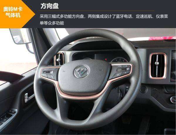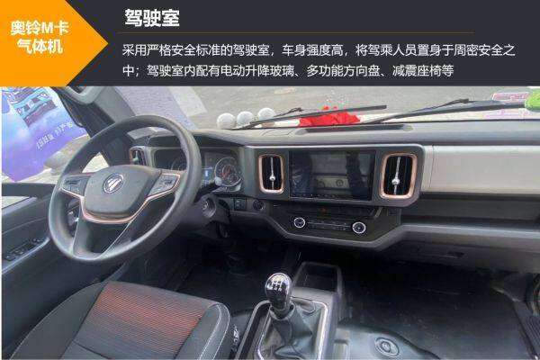 奥铃M卡气体机采用严格安全标准的驾驶室,车身强度高;内部宽敞舒适,整车储物空间超多,驾驶员出行物品再多也放得下;并配有电动升降玻璃、多功能方向盘、减震座椅等,让驾驶员的驾驶更方便舒适。