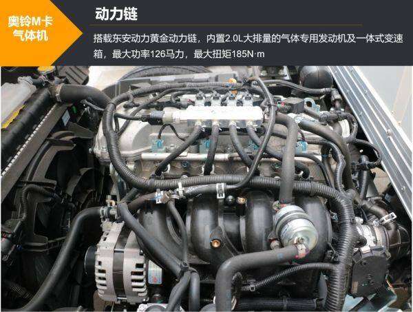 奥铃M卡气体机搭载东安动力黄金动力链,内置2.0L大排量的气体专用发动机及一体式变速箱。这款东安N20气体机针对CNG专向研发,最大马力126马力,最大扭矩185N·m;采用高压缩比、Atkinson循环、外部EGR等技术措施,实现高度节能减排,气耗低于行业同类产品6%-14%;通过减摩涂层、短裙活塞、低摩擦轴瓦、轻量化连杆、大偏心曲轴等设计达成深度减摩,动力强劲输出稳定,而且保养周期更长,运营效率更高,可以为用户创造更多价值。