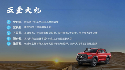 值得一提的是,2023款越野炮产品力升级的同时,增配不加价,并带来“金融礼、置换礼、互联礼、服务礼、推荐礼”五重大礼!面对这样一款超值的全能专业玩伴,你有没有感到内心躁动?不妨拿下2023款越野炮,勇敢从容踏上征途,开启超乎想象的越野旅程!