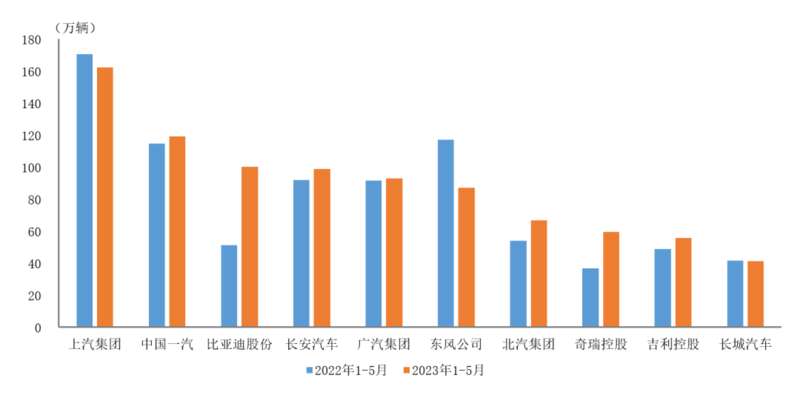 据中国汽车工业协会统计分析,2023年1-5月,汽车销量排名前十位的企业(集团)共销售883.9万辆,占汽车销售总量的83.3%。