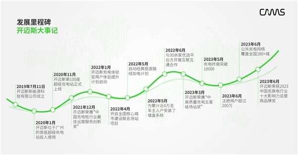 自 2019 年成立以来,开迈斯快速推进高质量充电基础设施建设,并结合家庭充电、公共充电和目的地充电等场景开发了创新解决方案。2023年,开迈斯继续致力于以用户为中心的整合创新,打造最具创新性的充电基础设施生态系统和全场景的充电服务,支持大规模智能电动出行。截止今年6月底,开迈斯充电网络覆盖国内超过180城,建设1,250座充电站和10,950个充电终端,服务超过200万注册用户。在全国16个城市实现主城区5公里范围内有1座充电站的便利度,并将于2023年扩充至26城。到2025年,开迈斯计划扩增充电终端数量至超过17,000个,并将覆盖中国绝大部分城市。