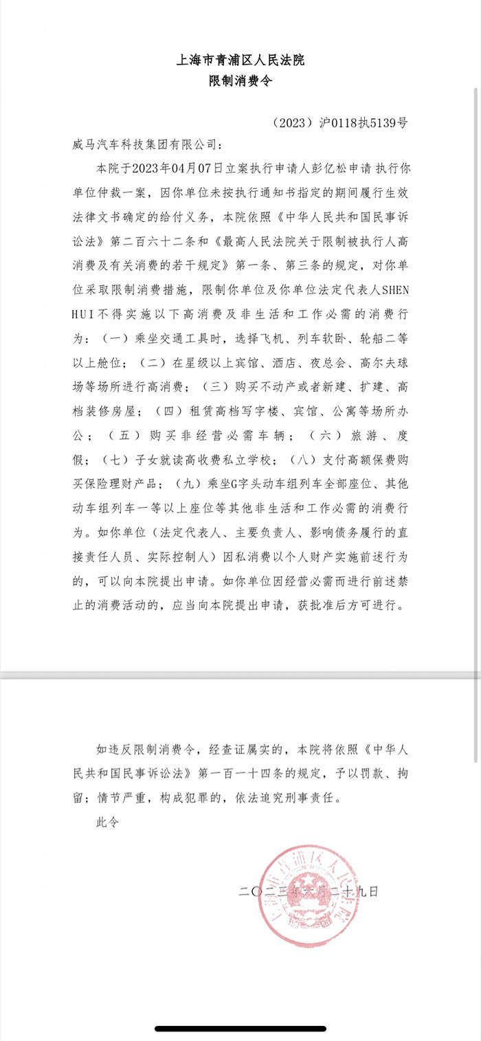 中新网7月3日电(中新财经记者 葛成) 据中国执行信息公开网信息,近日,威马汽车科技集团有限公司新增一则限制消费令。信息显示,申请人为彭某某,涉及仲裁案件,立案时间为2023年4月7日,执行法院为上海市青浦区人民法院。