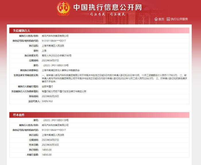 因执行标的14065元全部未履行,法院认为威马汽车科技集团有限公司有履行能力而拒不履行生效法律文书确定义务,将公司及单位法定代表人SHEN HUI列为失信被执行人。限制威马汽车及公司法定代表人SHEN HUI不得实施高消费及非生活和工作必需的消费行为。