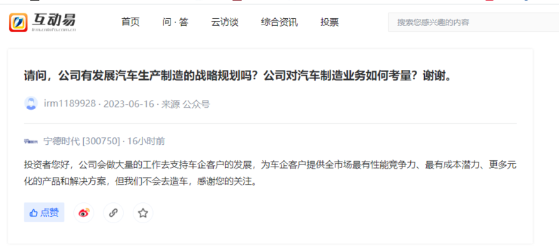 近日,有投资者在互动易平台上向宁德时代提问,宁德时代是否有发展汽车生产制造的战略规划?也有投资者称,强烈建议宁德时代切入整车产业链,实现全面的业务发展。