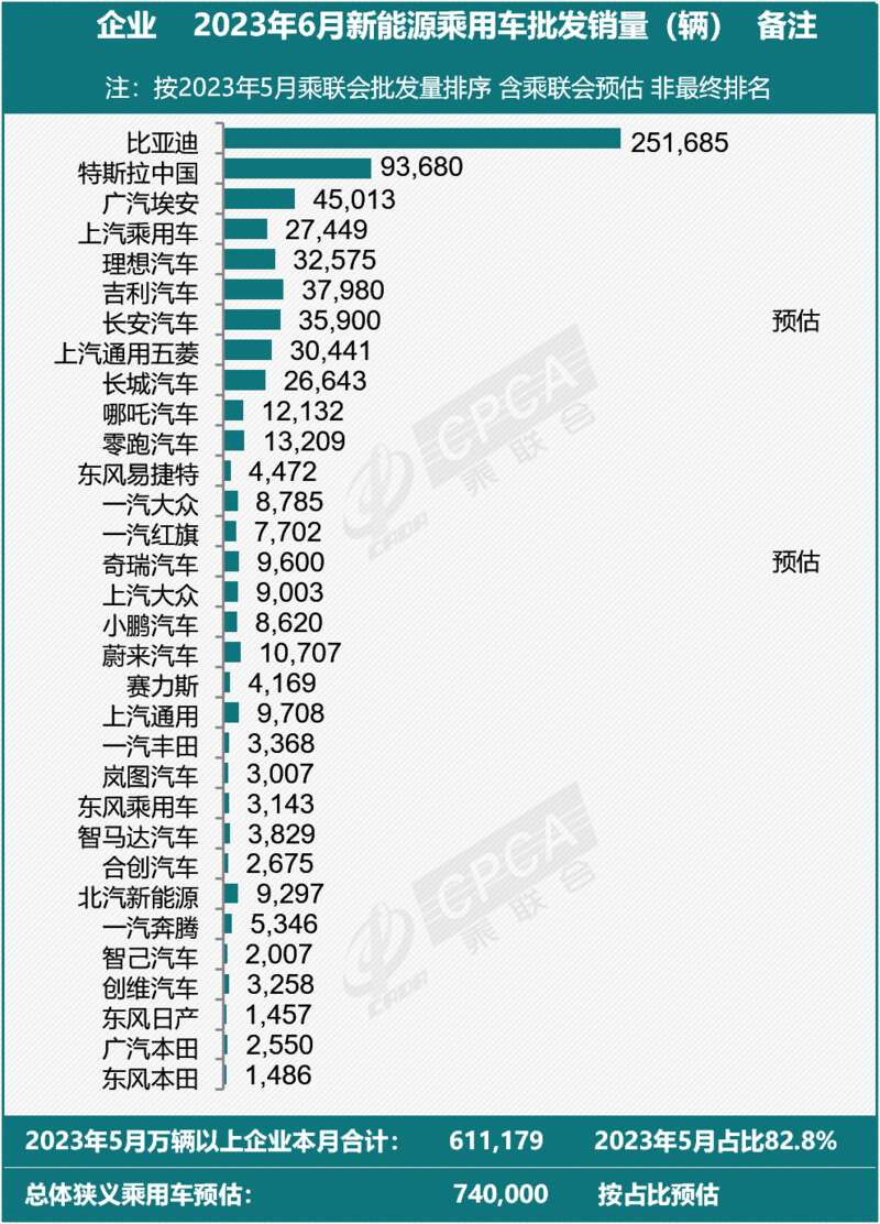 乘联会2023年5月全国乘用车市场,新能源销量万辆以上的12家厂商批发销量,占总体新能源乘用车全月销量的82.8%,这些企业的6月预估销量为61.1万辆,按照正常结构占比预测6月的全国新能源乘用车销量在74万辆。