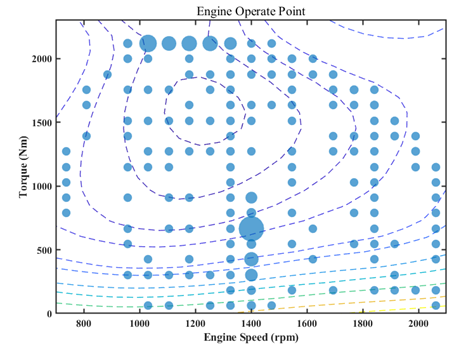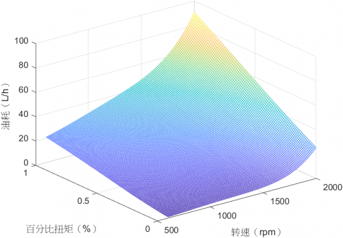 由于商用车后装MT车型占据主流,根据发动机的万有特性曲线,发动机在工作过程中转速和扭矩符合最佳经济区范围,如何获得不同车型发动机万有特性MAP图来优化车辆动力总成操控成为节油关键。通过分析比油耗BSFC与发动机转速、扭矩关系:BSFC=f(n,M) ,采样200组实验数据,进行数据建模和参数学习,可得到该车型的万有特性拟合曲面图如图1所示,该模型用于发动机模型中动力及油耗特性的计算过程。根据发动机功耗模型计算公式如下:FC=BSFC* Mn/9550/3600(g/h),其中FC代表瞬时油耗,用于实时计算发动机的能耗特性。