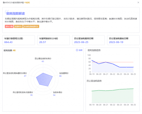 通过分析驾驶操控行为与油耗关系,建立相关性分析,针对不同驾驶员行驶特性差异,通过采集驾驶员实车行驶数据,基于大数据与机器学习方法挖掘驾驶员行驶特性,对不同驾驶员进行差异化分类,划分驾驶员节油行为等级,实现对驾驶员节油驾驶能力划分,节油评价和针对性纠正。如图3为所托物联云平台某客户车辆每趟次油耗和节油行为评价。