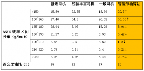 表2不同司机与智能节油算法发动机BSFC效率区间占比对比图