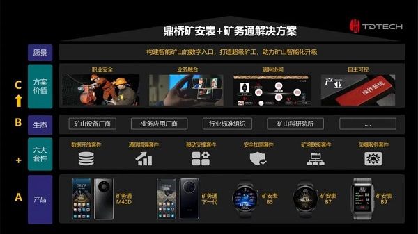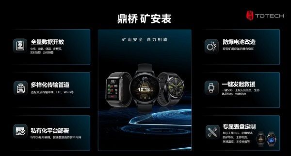 鼎桥深耕行业终端多年,秉承开放、创新、合作的基因,此次发布的与合作伙伴联合打造的,基于华为擎云穿戴产品的矿安表和矿务通系列产品,匹配数据开放、通信增强、移动支撑、安全加固、矿鸿联接、防爆服务等六大套件,助力伙伴打造了面向矿山行业的全栈终端解决方案。