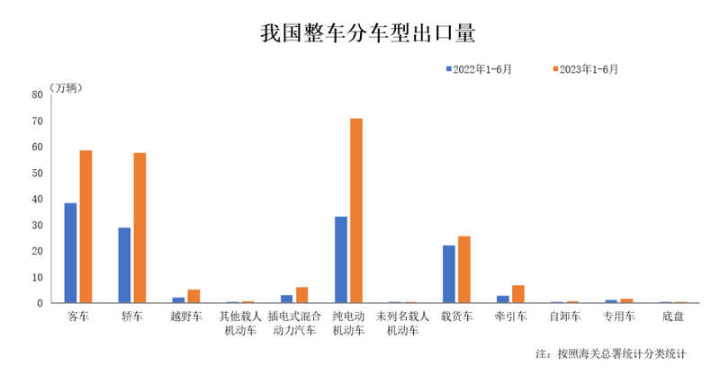 数据显示,2023年6月,在我国汽车主要出口车型中,纯电动机动车(10座及以上客车除外)、轿车、客车、载货车出口量分列前四位,与上月相比,轿车出口量小幅增长,客车、纯电动机动车(10座及以上客车除外)、载货车出口量均呈不同程度下降;与上年同期相比,载货车微降,其他三大类品种出口量均呈不同程度增长。
