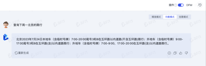 通过开启插件模式,DFM-2大模型可以智能调用外部信源和工具,为用户提供诸如“明日限号信息”等更准确、更实时的信息查询服务。
