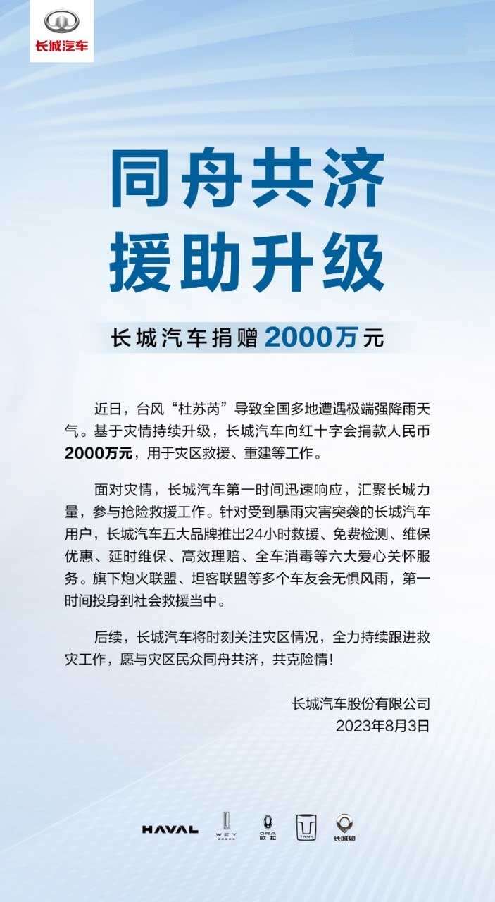 中国质量新闻网讯(马云龙)受极端强降雨天气影响,京冀地区近期遭受洪涝和地质灾害。8月3日,长城汽车向红十字会捐款人民币2000万元,用于救援和灾后重建等工作。