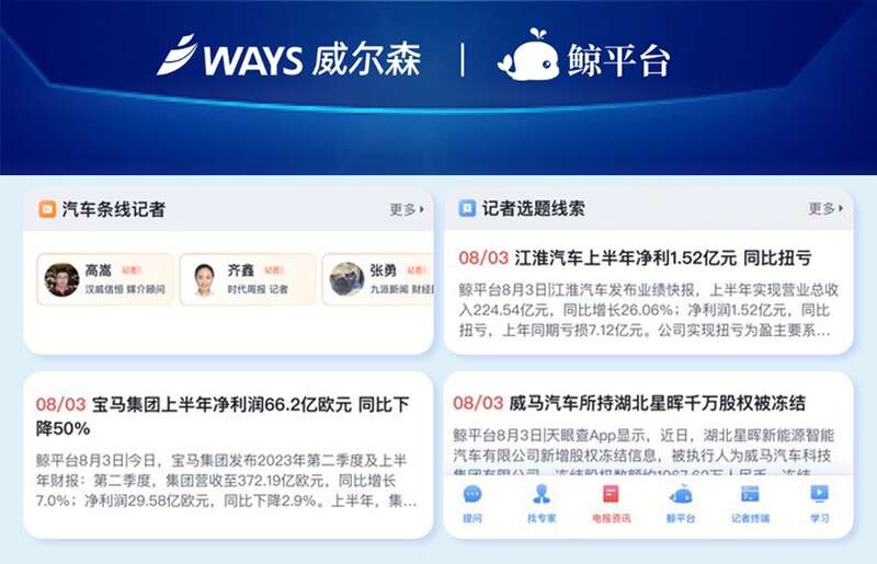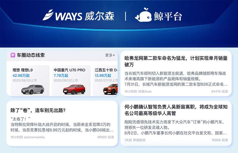立即下载鲸平台App,畅享全方位的汽车行业资讯与数据!威尔森与财联社鲸平台汽车频道,助力捕捉市场趋势,开创独特的新闻视角!