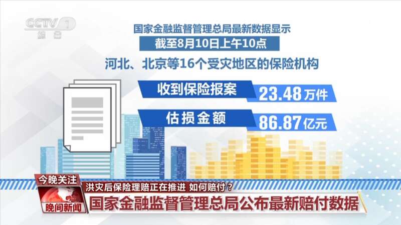 国家金融监督管理总局最新数据显示,截至8月10日上午10时,河北、北京等16个受灾地区的保险机构收到保险报案23.48万件,估损金额86.87亿元;目前已赔付案件9.23万件,赔付金额8.31亿元。