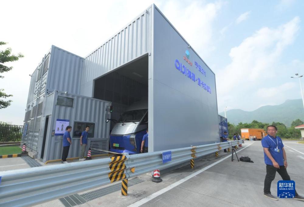 当日,福建首条高速公路重卡换电绿色物流专线在沈海高速公路福建宁德至厦门段投入使用。该专线由福建高速集团与宁德时代新能源科技股份有限公司共同建设,全程约420公里,共配备4座高速公路重卡换电站,旨在通过换电技术和模式创新驱动重卡行业全面电动化,全力推进交通运输行业绿色低碳转型。记者 林善传 摄
