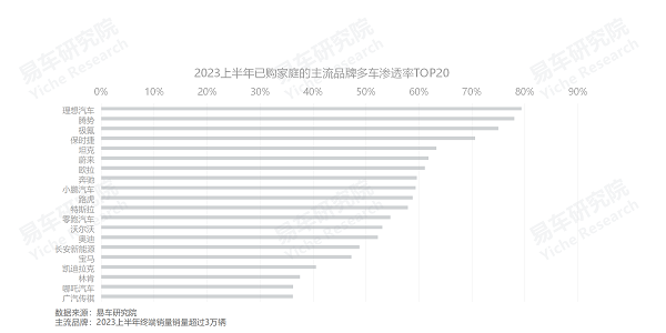 2023上半年,理想领衔已购家庭多车渗透率排行,高达79.36%,多车家庭车市正成为新势力的温床