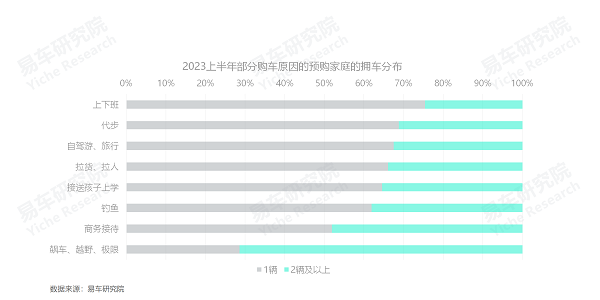 过去二十年,中国乘用车市场实现了爆发式增长,年销量从两三百万辆飙升至两千多万辆,期间绝大多数中国家庭用户都是第一次购车,核心诉求就是养家糊口,买车就是为了方便上下班。截至2023上半年,多数中国家庭已经完成了首购,部分完成了换购,接下来将追求更多、更好的汽车生活,会不断滋生出代步、自驾、接送、越野等聚焦“非上下班场景”的新需求,家庭拥车数量将随之提升;