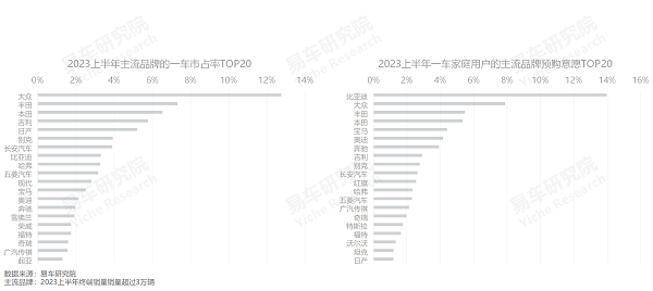 截至2023上半年,在所有一车用户的保有量中,大众的市占率高达12.76%,位居榜首,丰田、本田与日产之日系三强位列高位。但在一车用户的预购意愿排行中,大众、丰田、本田纷纷大幅下滑,日产则断崖式下滑;