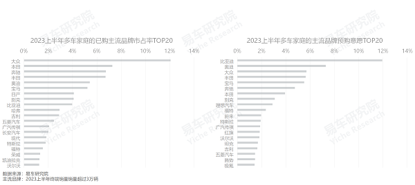 2023上半年,比亚迪领衔多车家庭预购品牌意愿占比排行,逼近12%,海洋与仰望、方程豹应积极夯实多车家庭的再购需求
